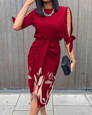 Sukienka mezzo midi za kolano rozcięcie z przodu na nogę dopasowana obcisła podkreślona talia pasek wiązany kokarda drapowana tulipan zabudowana dekolt okrągły rękaw 3 4 wycięte ramiona dziury mankiety kokardki Ronni